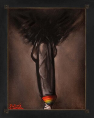 Correlando il binomio attività/passività alle categorie binarie maschile/femminile, buona parte delle concezioni psicoanalitiche “classiche” ha contribuito a creare stereotipi di genere, con profonde ricadute sull’immagine dell’omosessuale, che a livello mediatico e culturale viene a perdere la sua mascolinità e ad essere sempre più assimilato ad un’anima femminile imprigionata in un corpo maschile, andando così a confondere l’omosessualità con la disforia di genere. L’opera di Raffaele Ciotola, che pone una Rainbow Flag, da sempre emblema del movimento LGBTQ+, su un pene imponente, che potremmo identificare come simbologia della potenza virile, esemplifica la mascolizzazione dell’omosessuale moderno, rendendo in modo artistico un processo culturale che si vede già da qualche decennio e che sfida il vecchio stereotipo di omosessuale “femminilizzato”.